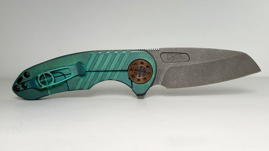 Curtiss Knives Custom F3 Med Wharny Flipper Pre-Owned - Blasted CPM Magnacut Wharncliffe Blade - Antique Green Titanium Slide-Milled Handle Scales w/ Root Beer Hardware - Frame Lock Flipper | Made in USA