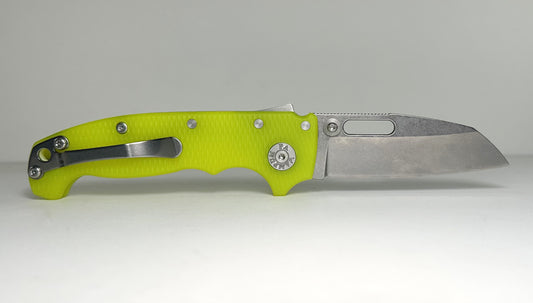 Demko Knives MG AD20S Pre-Owned Day Glow - Stonewash 3.6" CPM-S45VN Slotted Shark Foot Blade & Day-Glow G-10 Handle Scales - Shark Lock Folder w/ Dual Studs | Made in USA