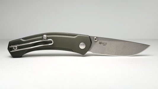 GiantMouse ACE Iona Pre-Owned - OD Green Aluminum Handle Scales & Stonewash 2.9" Bohler M390 Drop Point Blade - Liner Lock Manual w/ Dual Thumb Studs | Made in Italy