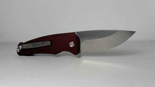 Medford Knife & Tool Smooth Criminal PRE-OWN - Tumbled S35VN 3" Drop Point Blade & Maroon Red Aluminum Handle - Button Lock w/ Flipper Tab