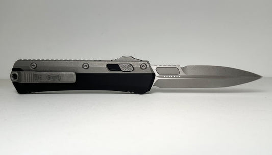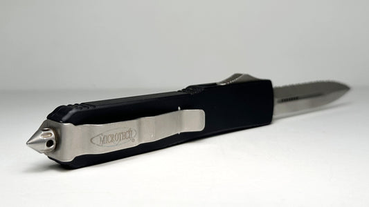 Microtech Ultratech OTF 122-12 Pre-Owned, USED & Sharpened Flat Body DOB 10/2012 - Stonewash S35-VN One-Side Fully Serrated Double Edge Blade & Black Aluminum Handle