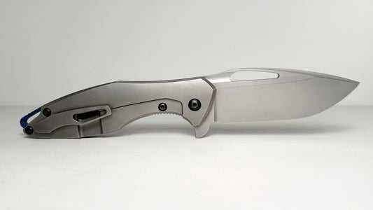 Koenig Arius Gen 2 Frame Lock Flipper Pre-Owned - Stonewash CTS-XHP Drop Point & 3D Contoured Titanium Handle - Blue Backspacer & Black Pivot | Made in USA