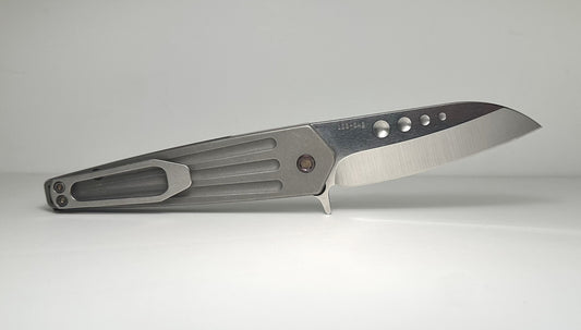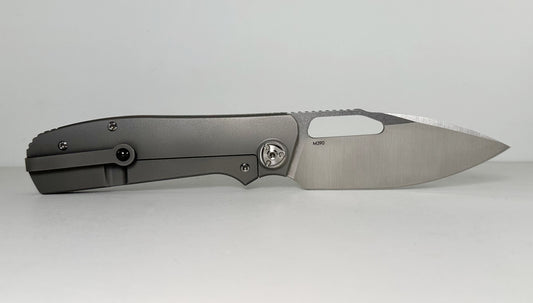 Medford Knife & Tool Nosferatu Flipper Pre-Owned - Tumbled Statin 3.5" CPM-S35VN Sheepsfoot Blade & "Old" Tumbled Titanium Handle - Flamed Hardware - Button Lock Flipper | Made in USA