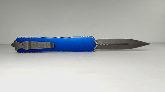 Microtech Dirac Delta 227-10DBL Pre-Owned - Apocalyptic Bohler M390 Double Edge Dagger Blade & Distressed Blue 6061-T6 Aluminum Handle - Out the Front Automatic | Made in USA