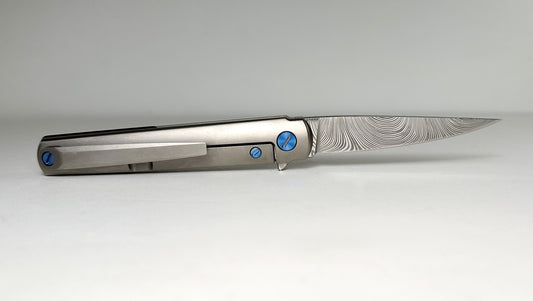 Zieba MS3 Pro EDC Flipper Damasteel Pre-Owned - Twist-Patterned 2.75" Damasteel Blade & Blasted Titanium Handle - Blue Ti Hardware & Carbon Fiber Backspacer | Made in USA
