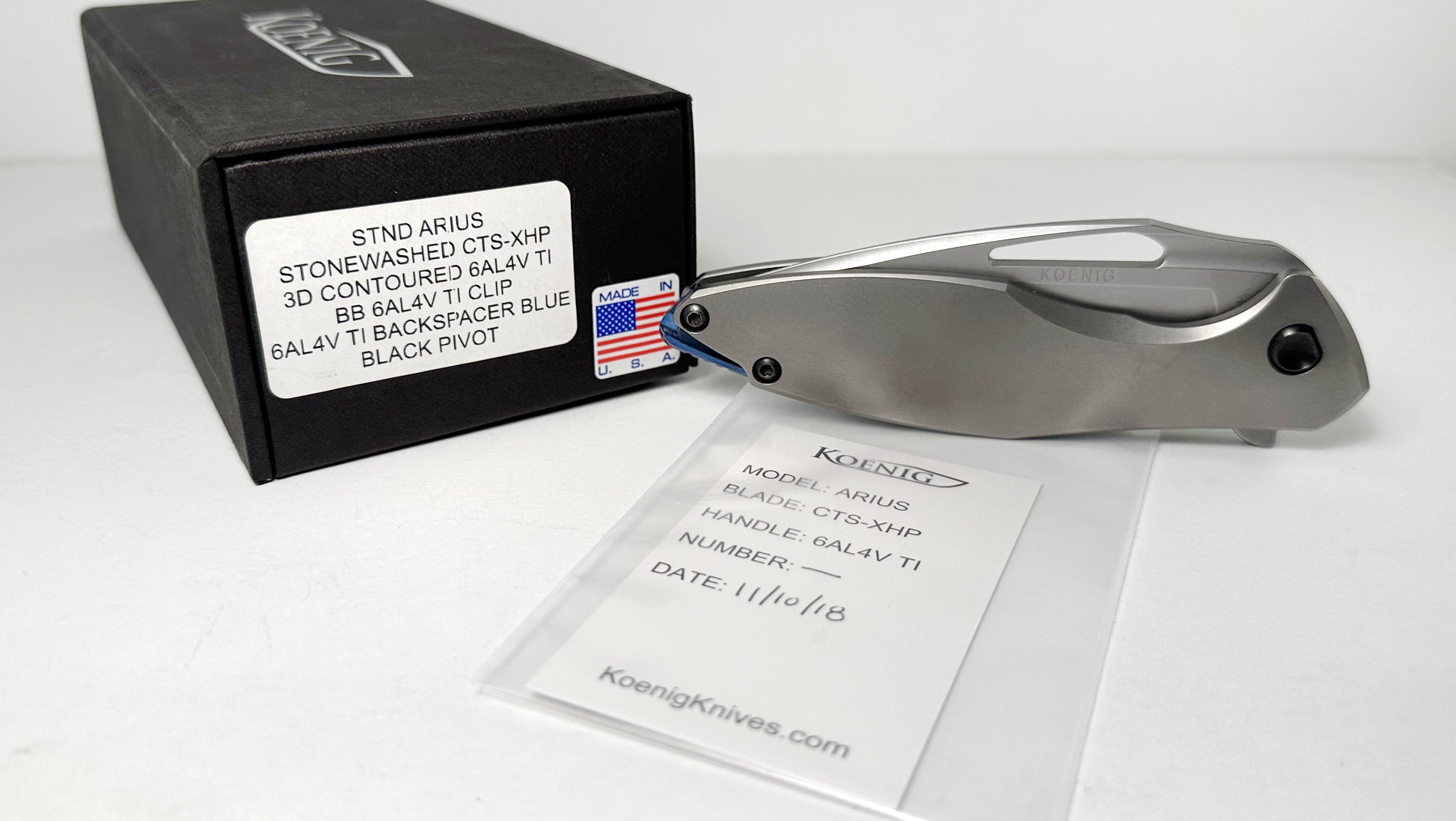 Koenig Arius Gen 2 Frame Lock Flipper Pre-Owned - Stonewash CTS-XHP Drop Point & 3D Contoured Titanium Handle - Blue Backspacer & Black Pivot | Made in USA